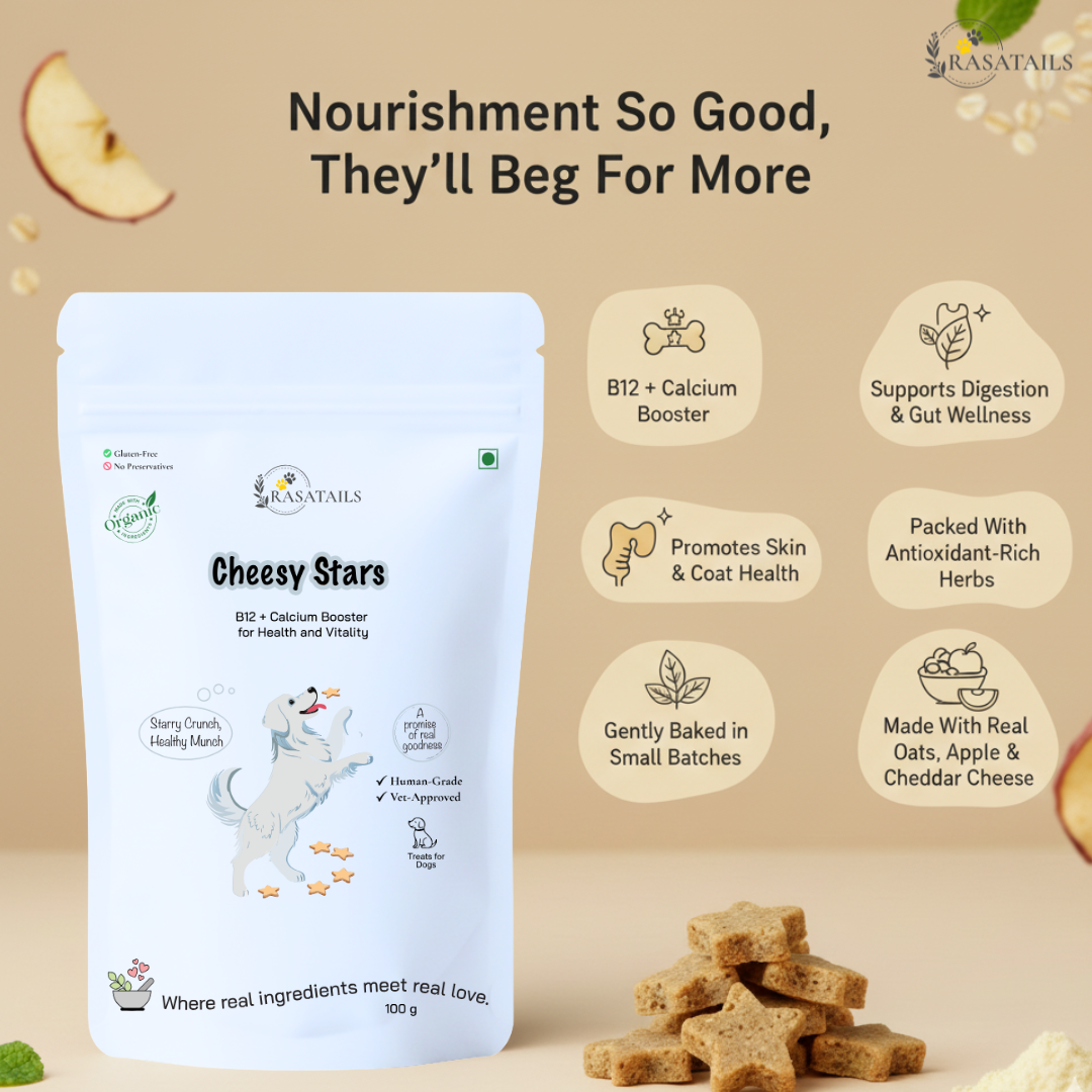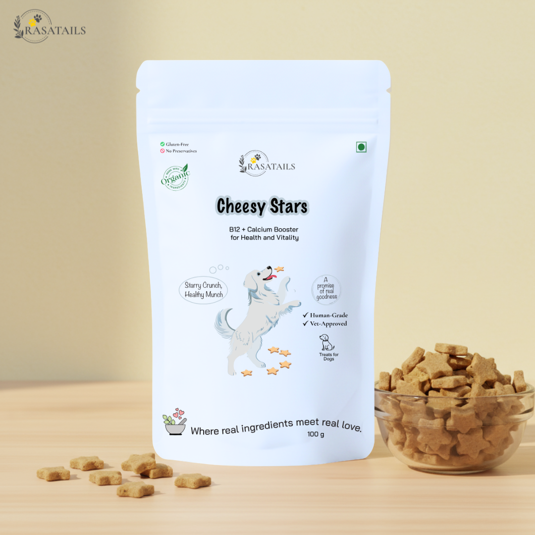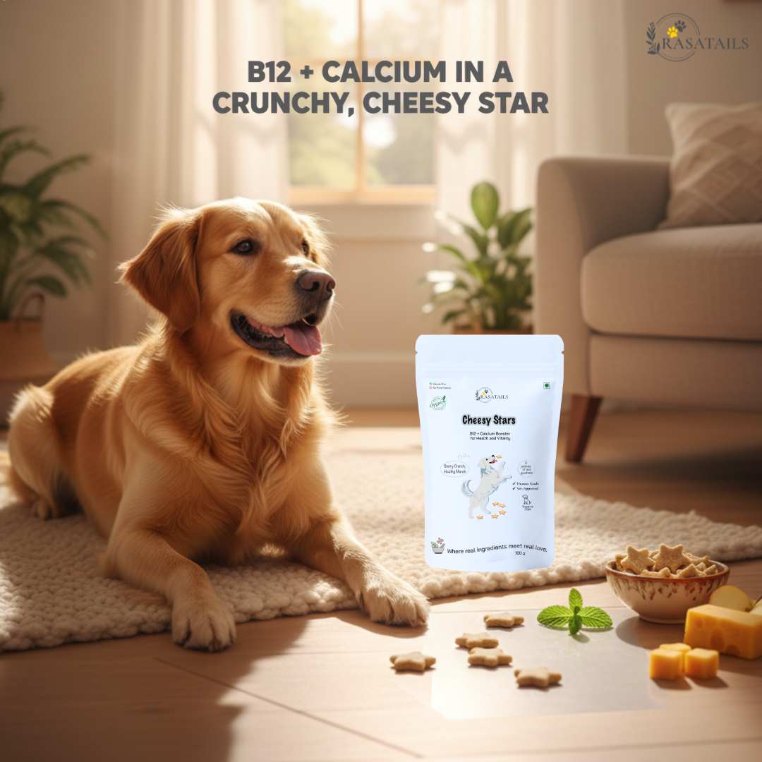 Cheesy Stars—fun-shaped vegetarian treats packed with B12, calcium, and natural goodness to keep your dog strong, energetic, and full of life.